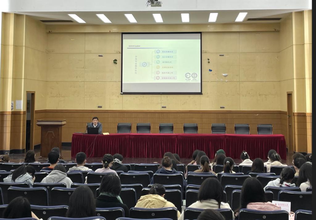 在仙林校区德济楼二楼报告厅举办南财就业创业讲堂-税务师行业的现状和未来,讲座由院党委副书记王翔主持,江苏省峰上税务师事务所所长马一军主讲,学院2019级全体学生参与讲座。
