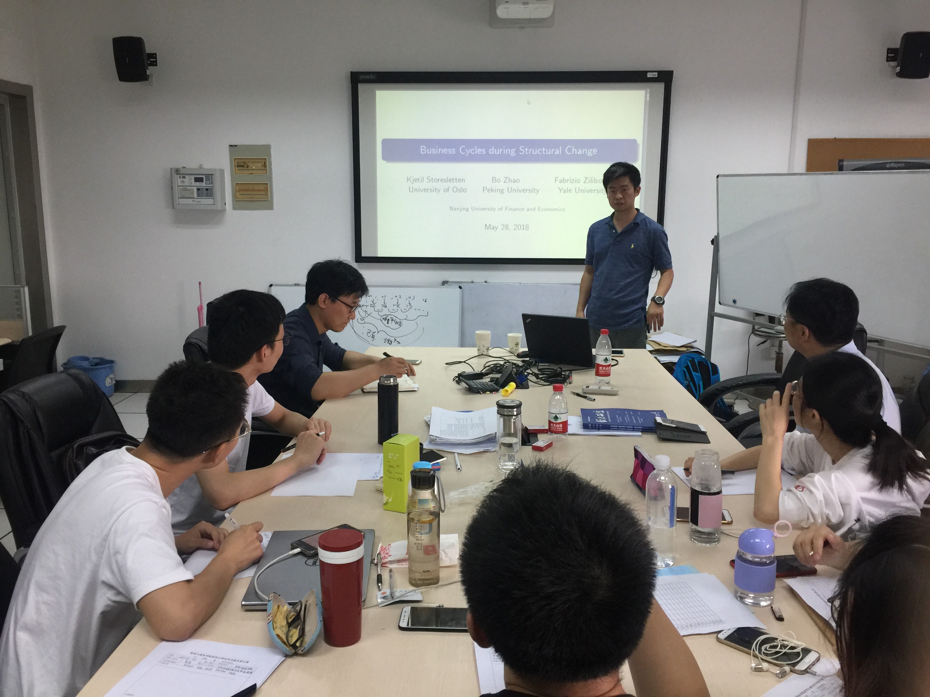 报告中,赵波博士通过图表形式进行了深入浅出的讲解。他指出:美国的就业和产出存在高度的相关性,而中国总就业波动性远低于经济波动性,相对于美国较为平滑;进一步细化分析,GDP上升时,农业就业增速下降,农业和农业就业呈现此起彼伏的关系;农业就业人口比率呈下降趋势,当经济衰退时,中国农业就业人口比重下降变缓,美国下降也变缓;发达国家呈现就业顺周期,发展中国家呈现就业逆周期;中国农业资本深化较低,发达国家农民的劳动生产率较高,甚至高于工人的劳动生产率。针对这个话题,赵波博士指出:他们的全新研究框架将来可以纳入政府财政干预的因素,拓展财政政策的应用空间。这为在场的同学拓展了一个新的研究视角,参加的同学最后纷纷索取了赵波老师的课件,进行进一步的学习和阅读。