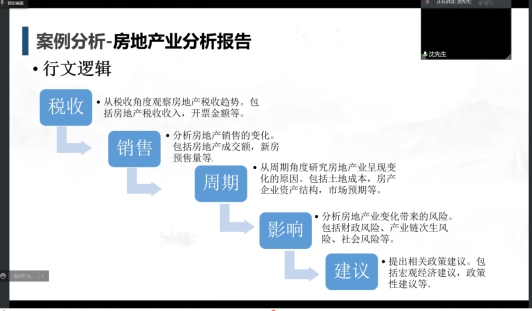 报告伊始,沈向民处长分析介绍了税收经济分析的一般意义;接着,他侧重全面描述了税收经济分析的主要职责:税收形势分析、税收风险分析、政策效应分析和经济运行分析等。其中,重点阐述了政策效应分析和经济运行分析。政策效应分析是利用多种分析方法,全流程密切跟踪税制改革和税收政策变动的实施情况,从而提高税收决策的科学水平。经济运行分析是利用税收大数据优势,从税收角度观察和反映经济运行状况,把握经济高质量发展状况,折射经济社会发展中值得关注的问题。经济运行分析应包括重大战略分析、区域经济分析、防范经济运行风险分析、重点行业经济税源分析、“四新”税收经济分析、培植涵养税源分析等六个维度,最后,沈处长以房地产业分析报告为案例,具体阐述了撰写分析报告时应具备的多个基本要素与要求,即:方向正确、逻辑严密、方法科学、数字准确、文字凝练、建议可行。