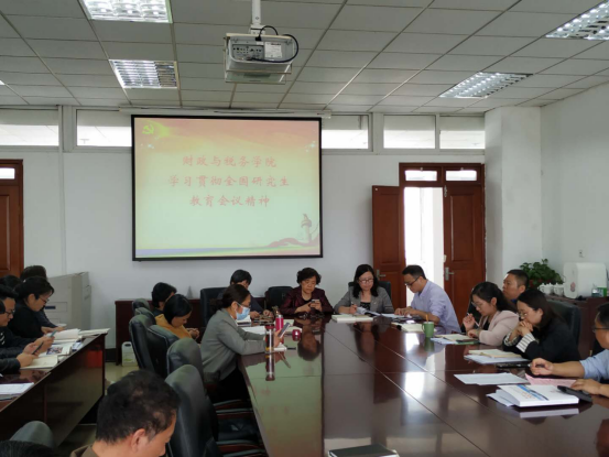 于10月14日下午在德经楼408会议室召开财税学院贯彻学习全国研究生教育会议精神会议。学院全体教师参加会议,会议由朱军院长主持,院长助理骆永民领学,院党委书记陈苏、院长朱军发表学习感言。在召开此次会议之前,学院已经整理了全国研究生教育大会相关学习资料并转发给全体导师开展学习。