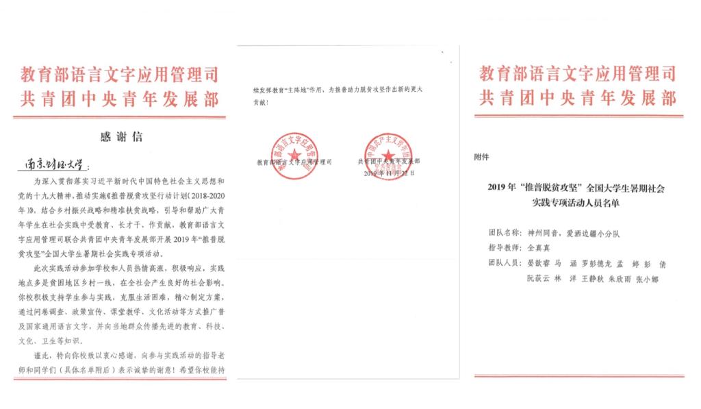 近日,教育部语言文字应用管理司和共青团中央青年发展部联合向体育博彩 发来感谢信,对我院的助力“推普脱贫攻坚”专项暑期实践活动表示感谢,对参与此次活动的师生予以表扬。
