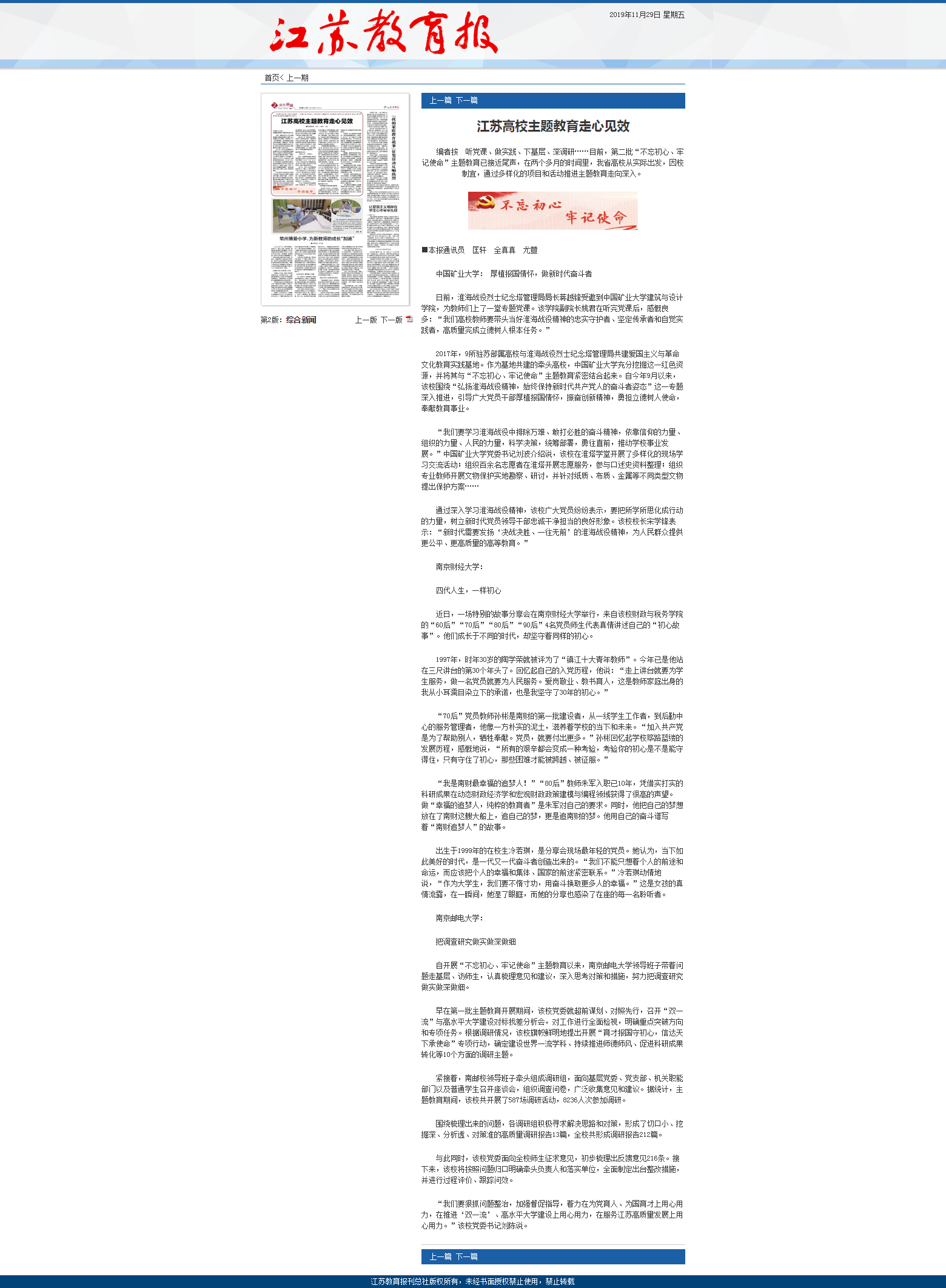 11月29日《江苏教育报》第二版,刊登了题为《江苏高校主题教育走心见效》的文章,文中报道体育博彩