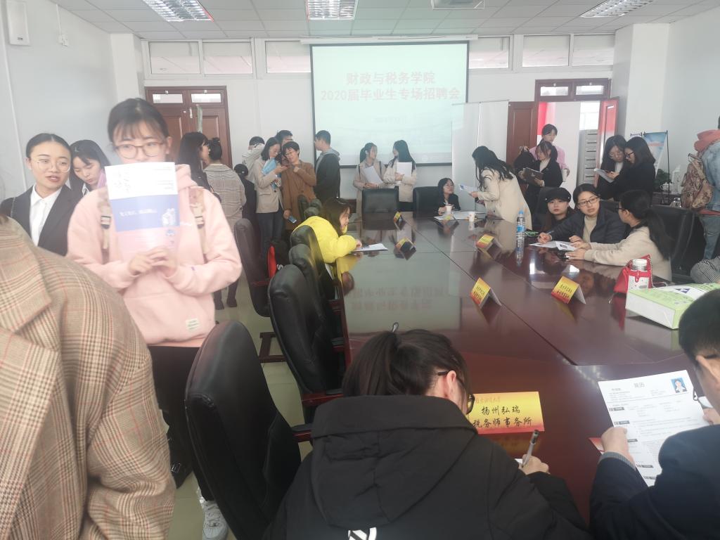 11月19日下午,财税学院2020届毕业生秋季专场招聘活动在德经楼408室举行。江苏省注册税务师协会副会长徐火财,办公室主任徐华敏出席招聘会,2020届毕业生参加了招聘活动。