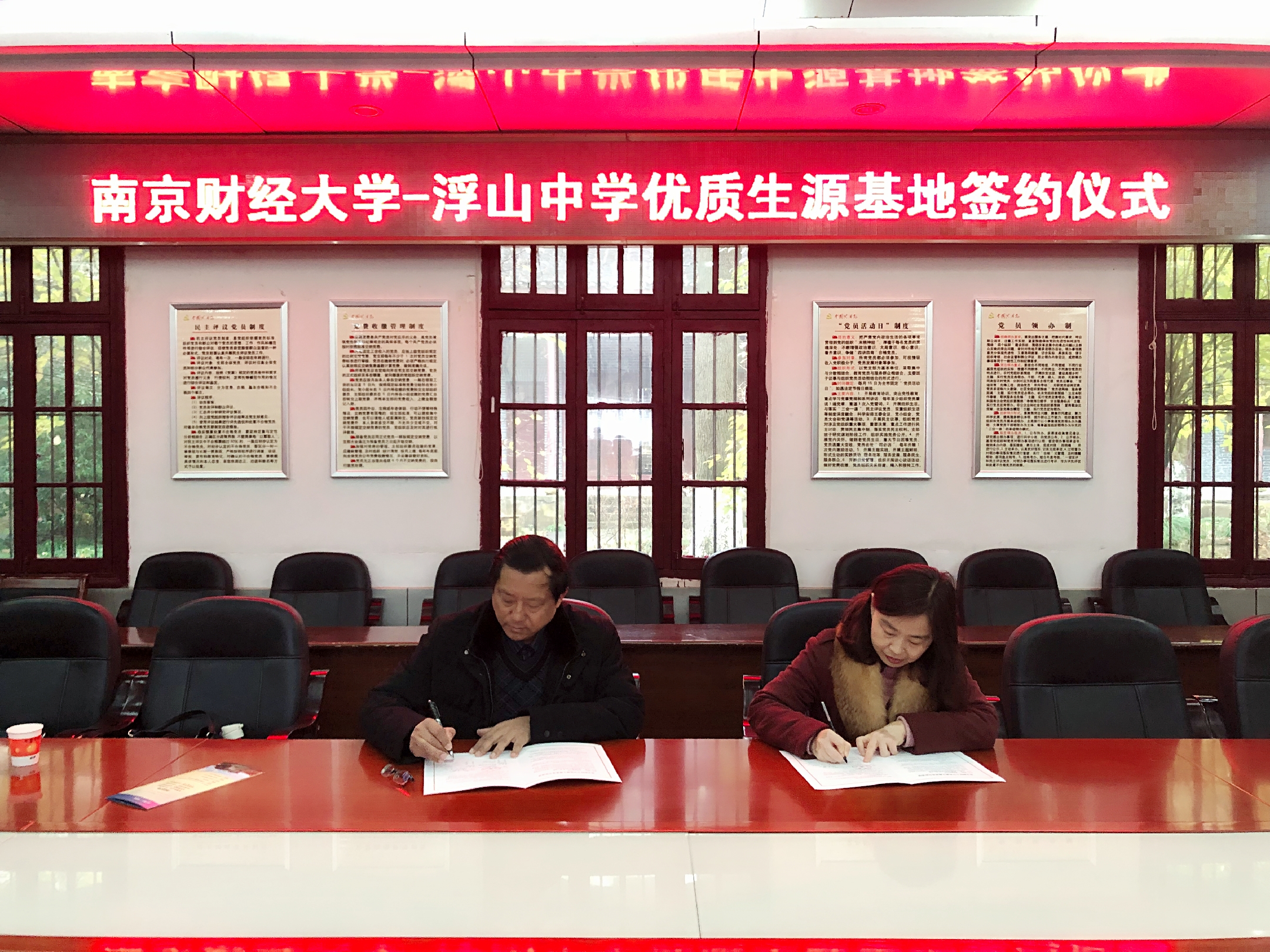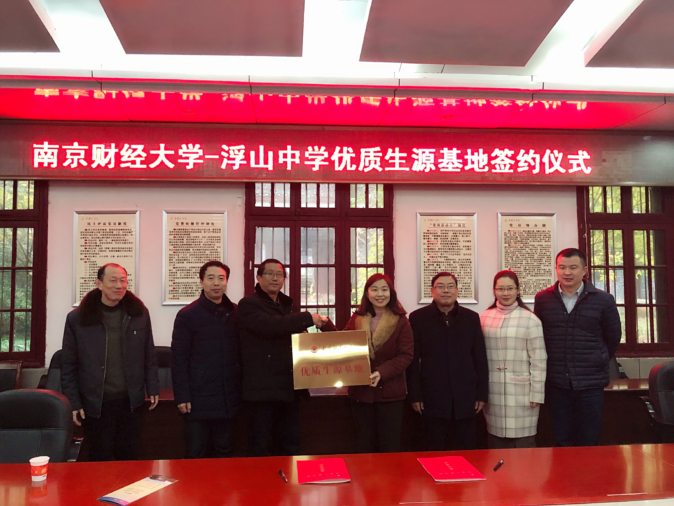 在安徽省浮山中学建立优质生源基地并举行签约授牌仪式。浮山中学校长唐晓发,书记王友明,副校长胡章友,教务主任杨俊兵,办公室主任吴强,体育博彩