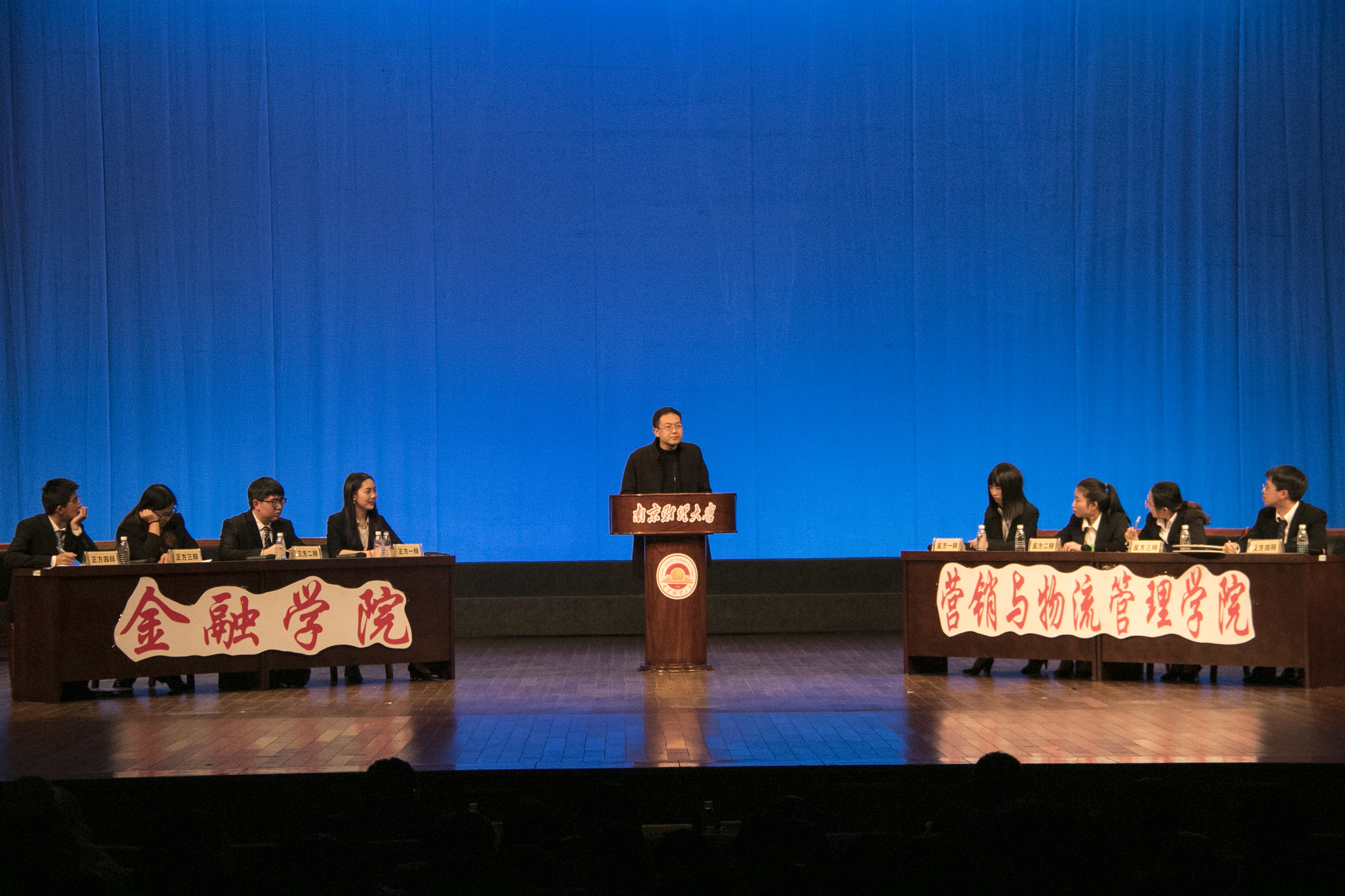 第十六届校园辩论赛决赛在大学生活动中心精彩上演。南京大学新闻传播学院博士生导师、南京大学校辩论队教练胡翼青,省希望办主任、江苏省青少年发展基金会秘书长、江苏省《风流一代》杂志社社长兼主编薛保刚,南京师范大学党委宣传部兼党委教师工作部副部长郭亮担任比赛评委。同时来到现场的还有校团委、党委宣传部、学生处、财税学院等部门的领导,以及南京师范大学、南京邮电大学、南京农业大学、南京中医药大学的辩论队代表和各学院的师生,现场座无虚席。