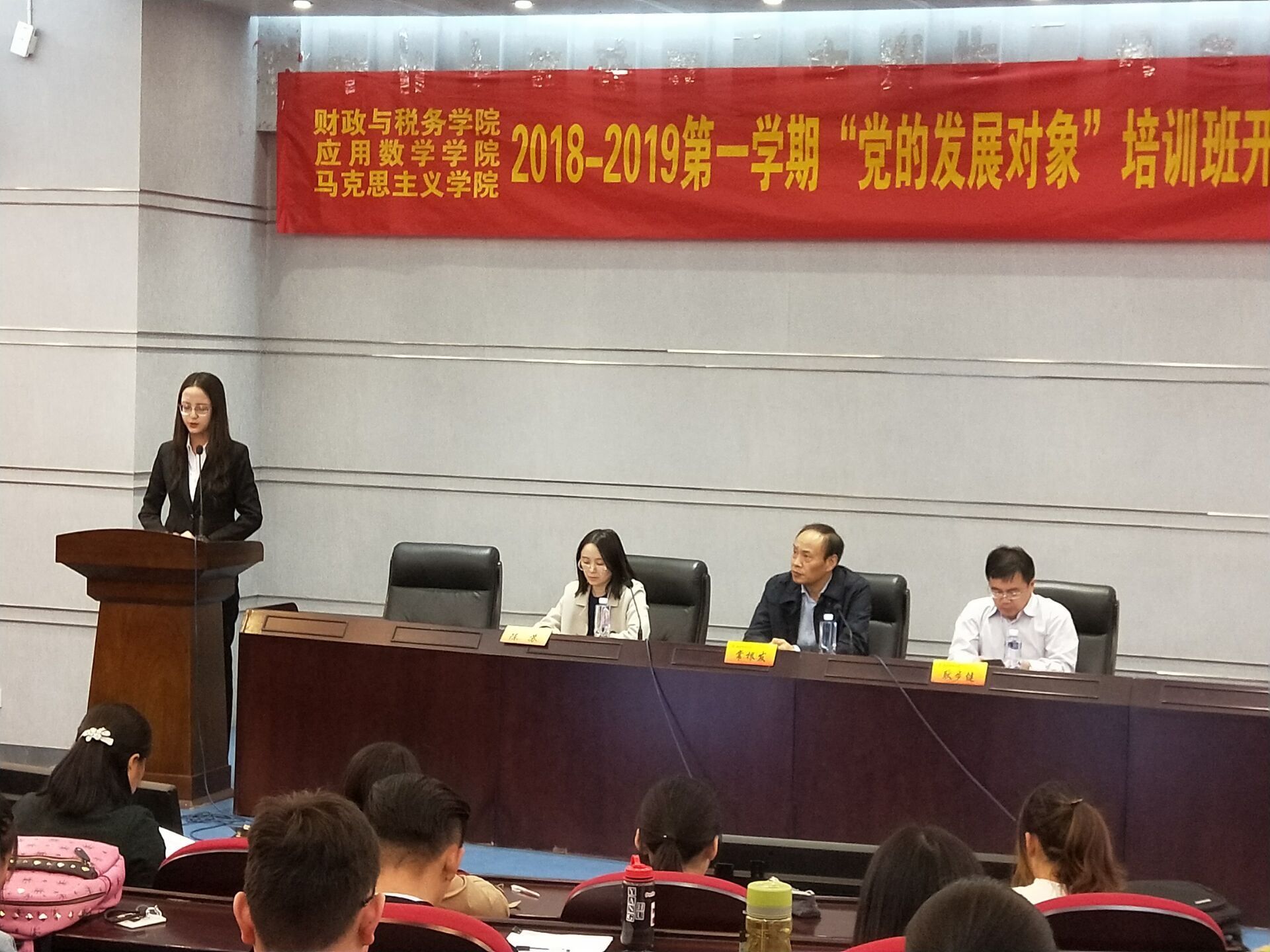 与应用数学学院、马克思主义学院联合开展的第十一期党校在行政楼2楼报告厅举行了开班仪式暨专题报告会。出席本次开班仪式的有财税院党委书记陈苏、应用数学学院党总支书记常根发、马克思主义学院党总支书记耿步健,全体党校学员参加了开班仪式。开班仪式由体育博彩