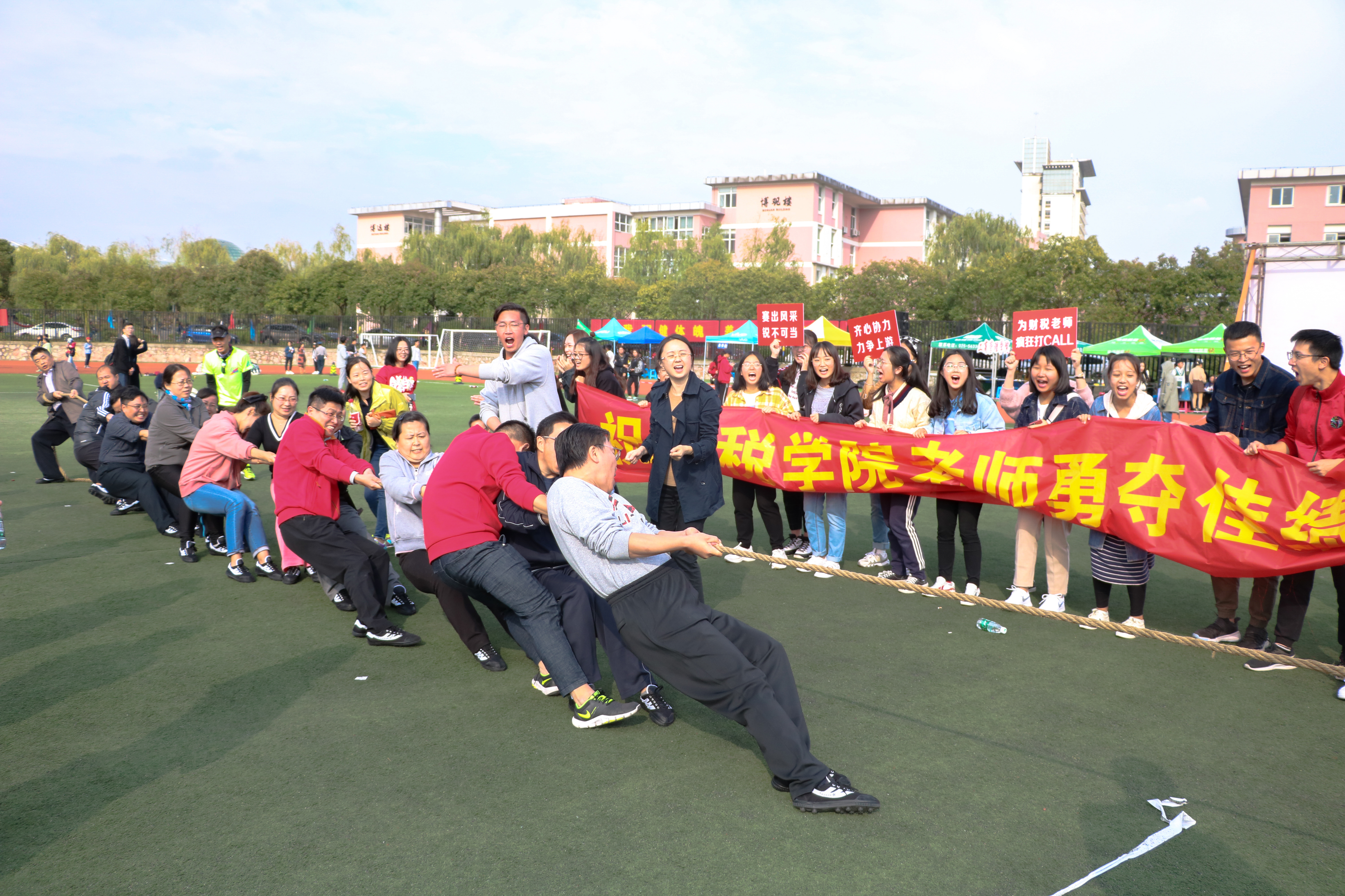 在师生4*100米接力赛中,刘志红、管永昊两位老师与刘世玉、杨翼虎两位同学联合组队,获得了第八名的好成绩。接下来的“步步为赢”、女子铅球、男子三级跳、女子1500等比赛中财税学子均以拼搏的精神、团体的凝聚力赢得了好成绩。而在教工组的比赛中,体育博彩