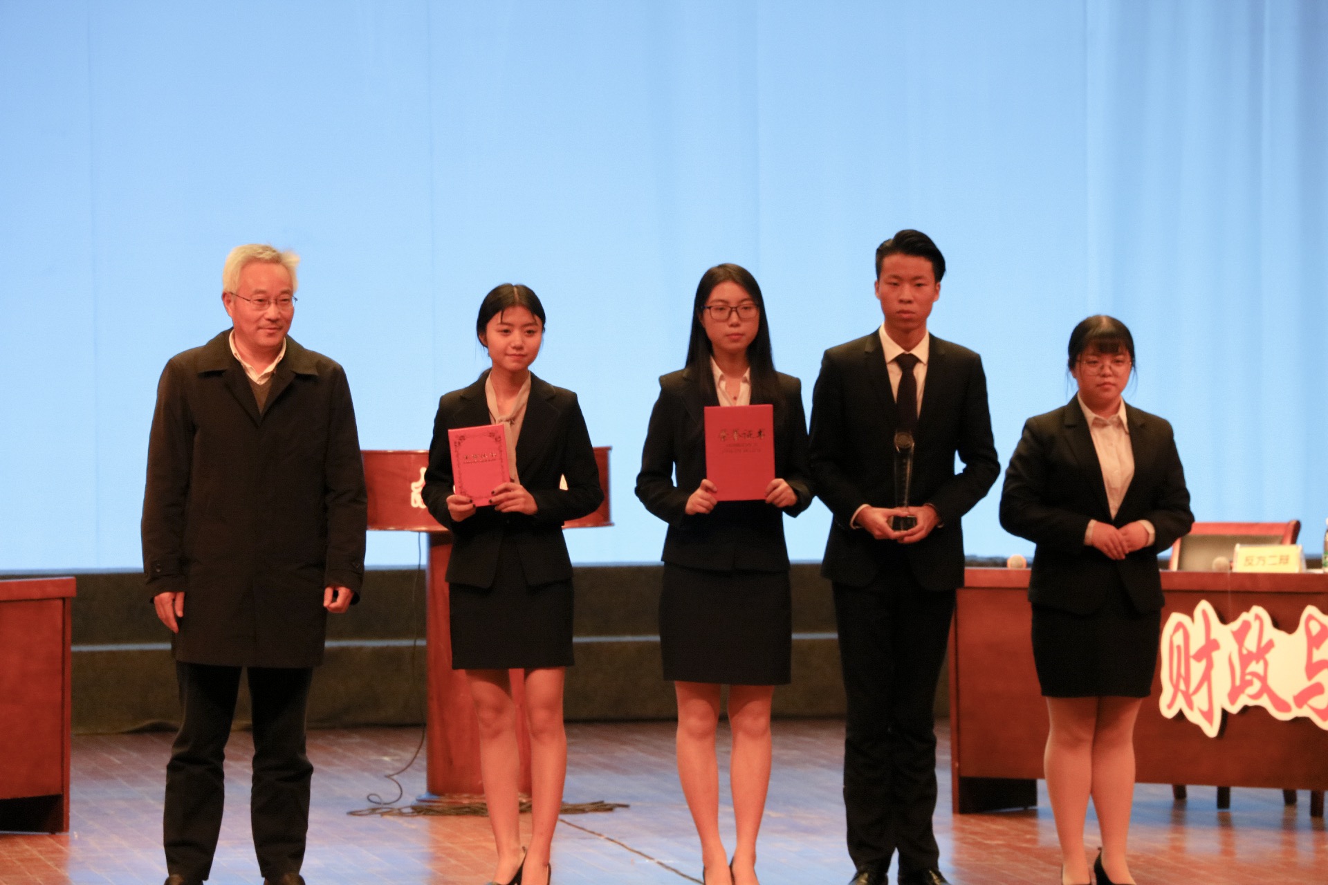 申珅、金融学院刘澳、经济学院朱睿、国际经贸学院张博琳、国际经贸学院岑鹭雅、管理科学与工程学院陶云杰。相关领导为获奖选手及获奖代表队颁奖并且集体合影留念。