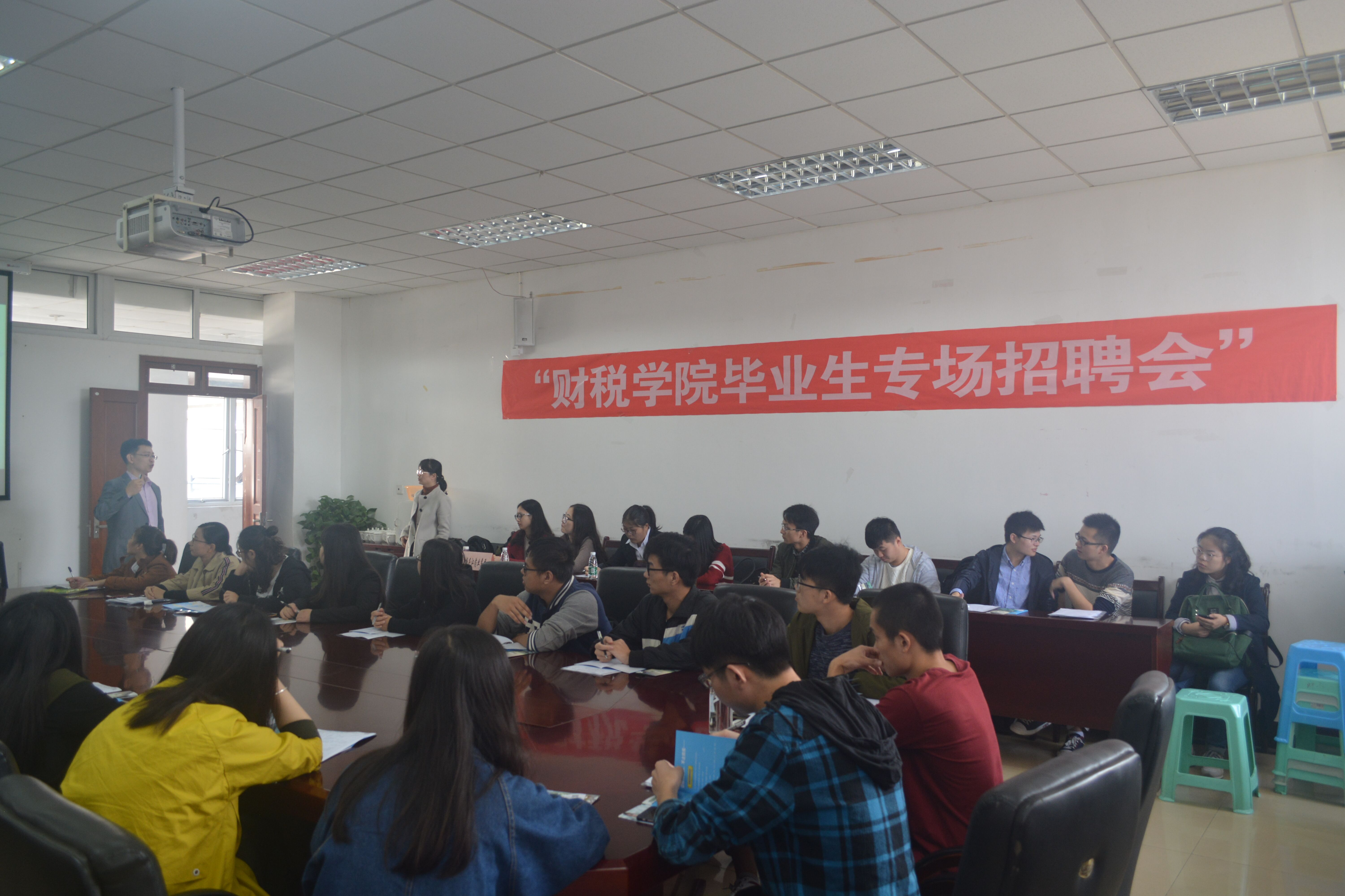进行校园招聘。公司代表宣讲了公司概括及业务状况,并具体向同学们介绍了笔试、测评注意事项及笔试、测评操作指南等。招聘会现场气氛热烈,来自财税学院、会计学院、金融学院、信息工程学院等各学院的同学们认真聆听,积极互动,报名踊跃。