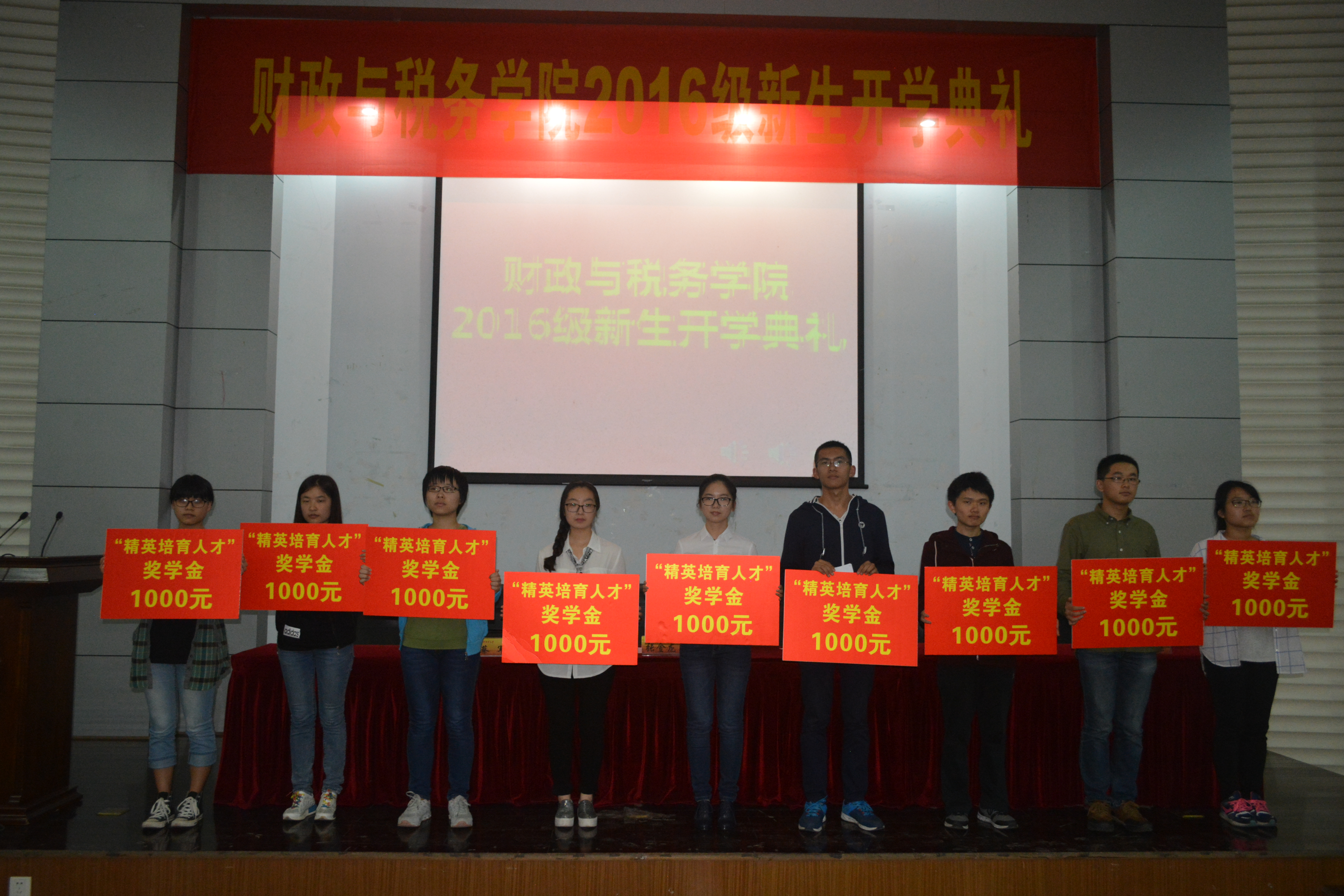 随后举行了2016年度 “财税学院精英人才培育奖学金”颁奖仪式。副院长管永昊向大一新生宣读了学院“精英培育人才奖学金”的管理办法及获奖名单。王承晞、李舒婷等9名2015级同学获得奖学金,第一批奖金为每人1000元。