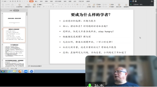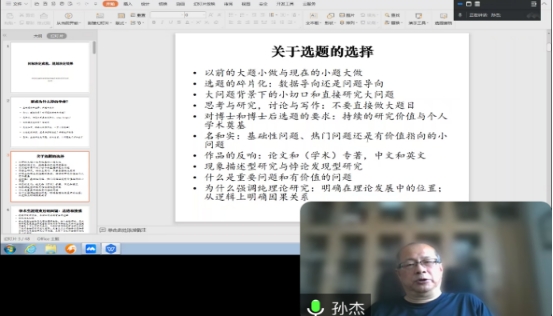 讲座伊始,孙杰教授首先指出要成为什么样的学者,指出在工作学习生活中要有主动意识和选择意识。首先要树立一个目标,一个没有明确目标的人,就像漂泊在海上的船只,没有方向,没有目标,最终只会在茫茫大海中迷失方向。只有明确了自己的目标,才能在前进的道路上有所依据,才能更加坚定地朝着目标前进,不断调整目标,不断努力,不断前进。