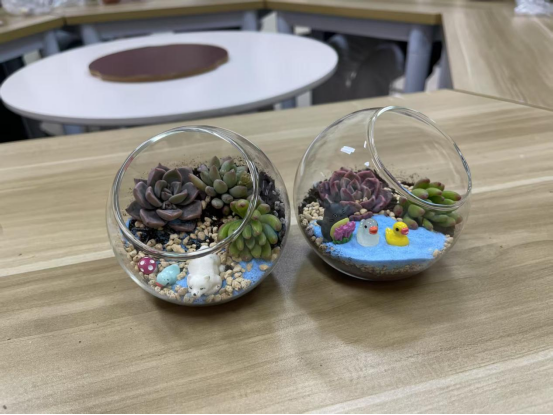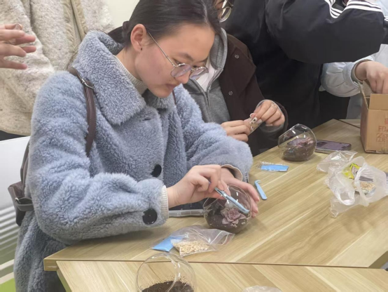 生态瓶制作,创意无限。春日校园,活力满满。财税学子们齐聚中苑“一站式”学生社区“初心小站”共同制作绿植创意手工。活动伊始,优秀学生代表向大家讲解了绿色经济的基本理念,并详细介绍了生态瓶的“四层结构”。通过生动的讲解和互动问答,同学们对绿色环保有了更深入的了解,对绿植种植也有了更浓厚的兴趣。绿植创意手工活动环节中,同学们依次领取了小生态瓶、苔藓片、多肉植物等材料和装饰品,开始发挥创意进行制作。大家小心翼翼地将绿植种植在生态瓶中,再搭配上彩色小石子等装饰品,一个个独具特色的小生态瓶逐渐成型,水珠从饱满的多肉上缓缓坠落,植物仿佛会呼吸般,激发出勃勃的生机活力。在这个过程中,同学们不仅享受到了创作的乐趣,还体会到了照顾生命的责任感。